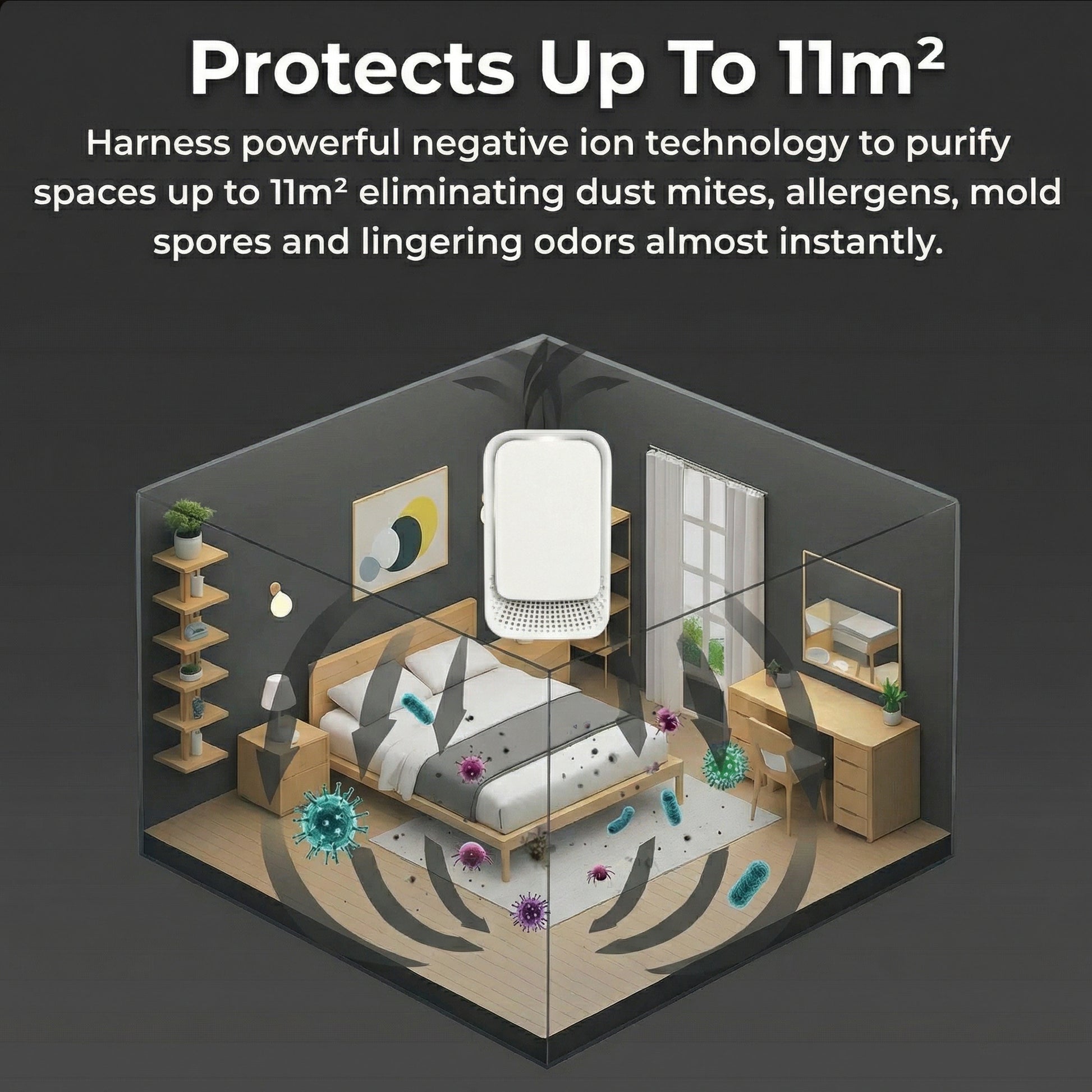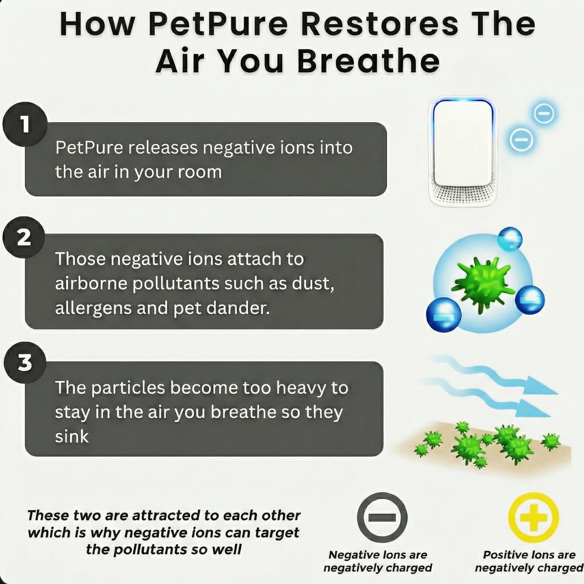 PureBreath™ fixes that! It uses Negative Ion Technology to quietly clear the air of irritants. No filters, no noise, and no effort. Just plug it in and let it work while you sleep. By morning, your air feels cleaner, your body feels lighter, and you feel more like yourself again.
